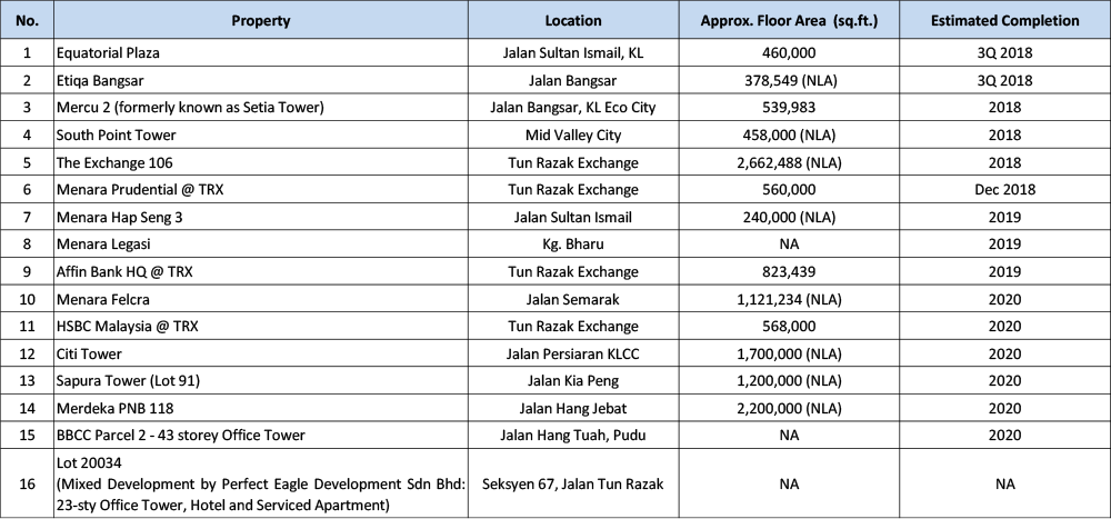 13 new purpose-built office buildings with a total space of approximately 3.651 million sqft saw completion in Kuala Lumpur in 2017. Notable buildings that was completed include: