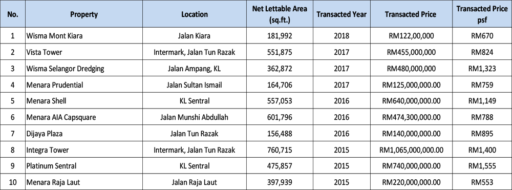 There are several significant office leasing transactions in 2017, majority of which took place within office buildings in Kuala Lumpur. The following Table 3 and Table 4 shows the notable office leasing and rental rates in selected purpose-built office buildings in Kuala Lumpur.